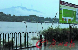 被譽(yù)為中國(guó)足球“明星搖籃”和培養(yǎng)中國(guó)足球裁判員“黃埔軍!钡膹V西梧州體育訓(xùn)練基地,位于緊臨西江的梧州市蝶山區(qū)龍湖鎮(zhèn),是原國(guó)家體委與地方共建的全國(guó)三大足球訓(xùn)練基地之一。前日以來(lái),隨著西江水位的不斷上漲,該體育訓(xùn)練基地開(kāi)始不斷被水蔓延。昨日下午,記者趕到時(shí),上百畝訓(xùn)練場(chǎng)地全部被大水淹沒(méi),水深處達(dá)兩米多,球場(chǎng)只露出一截40多個(gè)球門(mén),讓人們還能認(rèn)得出來(lái)這里原來(lái)是一處足球場(chǎng)地。同時(shí),記者也看到附近居民的房屋的一樓已經(jīng)泡在水中。(記者王廣永)
