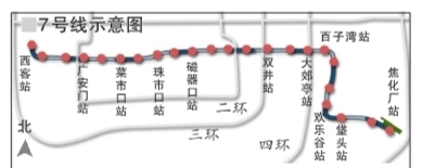 7號線全線23座車站,起于北京西客站,沿羊坊店南路向南至廣安門外大街后轉(zhuǎn)向東,沿廣安門大街、廣渠門大街向東至東四環(huán),在化工二廠東側(cè)轉(zhuǎn)向南穿越化工路后,沿垡頭西路向南至垡頭南路再轉(zhuǎn)向東進(jìn)入玻璃二廠、染料廠等工業(yè)用地范圍,線路沿規(guī)劃道路向東南敷設(shè),到達(dá)終點(diǎn)焦化廠站。(記者郭鯤)