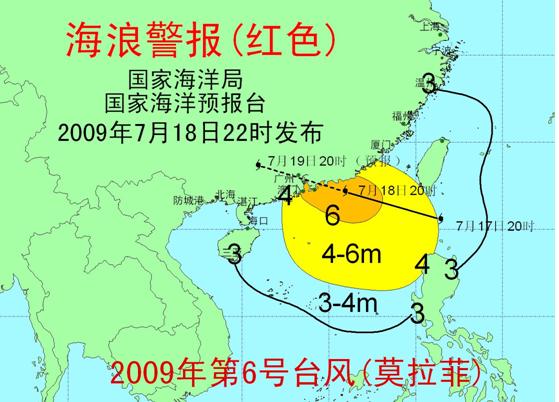 海洋預(yù)報(bào)臺(tái)稱,受今年第6號(hào)臺(tái)風(fēng)“莫拉菲”的影響,預(yù)計(jì)18日夜間到19日上午南海北部將出現(xiàn)6到8米的狂浪區(qū),臺(tái)灣海峽南部將出現(xiàn)4米的巨浪區(qū);廣東省東部沿海將出現(xiàn)4到6米的巨浪到狂浪,福建省南部沿海將出現(xiàn)2.5到3米的大浪,廣東省西部沿海將出現(xiàn)3到4米的大浪到巨浪,請(qǐng)沿海各有關(guān)單位及時(shí)采取防浪避浪措施,并關(guān)注我臺(tái)后續(xù)海浪預(yù)警報(bào)。