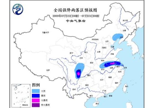 中新網(wǎng)7月22日電 中央氣象臺22日06時發(fā)布暴雨預報:預計,今天白天到夜間, 遼寧西北部、河南南部、安徽中北部、江蘇中南部、湖北北部、甘肅東南部、四川中部等地的部分地區(qū)有大到暴雨, 其中,四川盆地西南部、安徽中部、江蘇中部的局部地區(qū)有大暴雨。上述部分地區(qū)并伴有短時雷雨大風等強對流天氣。