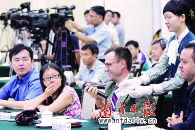 昨日下午3時(shí),廣州珠島賓館紅棉廳,來自美、英、法、德、日、韓、新加坡、香港等8個(gè)國家和地區(qū)20家境外主流媒體41名記者把長槍短炮架了起來。他們此次到廣東采訪,有一個(gè)共同的“條件”:“要見廣東省委書記汪洋”。