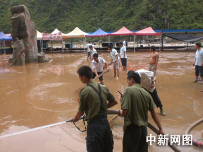 一到現(xiàn)場(chǎng),消防隊(duì)員就立即鋪設(shè)水帶。在專門消防器材的幫助下,消防隊(duì)員開始對(duì)廣場(chǎng)淤泥進(jìn)行清理。經(jīng)過(guò)艱苦奮戰(zhàn),通往景區(qū)的道路被打通,布滿淤泥的桃花谷廣場(chǎng)終于煥然一新,又露出了昔日干凈美麗的“面龐”。 完