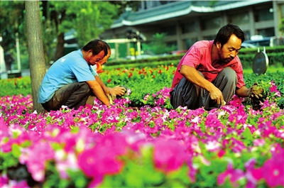 揭俊說(shuō),今年擺花重在設(shè)計(jì),每個(gè)花壇均將突出一個(gè)主題,比如:從新興橋至國(guó)貿(mào)橋布置的18座重點(diǎn)花壇。每座花壇都有一個(gè)叫得響的名字,如“大地歡歌”、“和諧家園”、“神舟飛天”等等,而諸如鳥(niǎo)巢、天壇祈年殿、三峽大壩等景觀也將為國(guó)慶添彩。