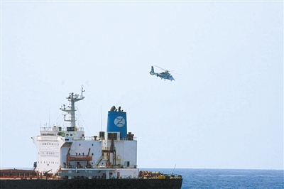 10時(shí)15分,“舟山”艦廣播里傳出命令:“直升機(jī)起降部署”。幾分鐘后,飛行甲板上鐵翼飛旋、馬達(dá)轟鳴,艦載直升機(jī)搭載著3名全副武裝的特戰(zhàn)隊(duì)員緊急起飛,向“嘉信”號(hào)商船疾速飛去,準(zhǔn)備驅(qū)離“疑似海盜船只”。1分鐘后,我方直升機(jī)在“嘉信”號(hào)上空懸停,3名海軍特戰(zhàn)隊(duì)員通過機(jī)降和滑降兩種方式迅速登船,為受“疑似目標(biāo)”威脅的商船提供隨船護(hù)衛(wèi)。(記者朱達(dá)、特約記者余子富)