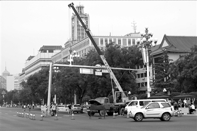 為保證來自四面八方的彩排隊伍能順利入場、退場,昨天下午,相關部門對彩排隊伍必經(jīng)路段上的橫臂式信號燈進行暫時拆除,因為此類信號燈具有指揮四面交通的功能,體積稍顯龐大,在有大規(guī)模的游行隊伍通過時,會造成不便。