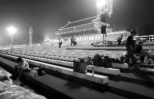 昨日,天安門城樓前東西兩側、人民大會堂北門外臨時觀禮臺上,工人開始加裝長凳,并鋪設紅色地毯。前日,孫中山像亮相廣場。
