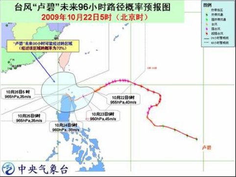 “盧碧”的中心22日5時位于菲律賓馬尼拉東北方大約650公里的西北太平洋洋面上,就是北緯19.1度、東經(jīng)125.1度,中心附近最大風力有13級(40米/秒),中心最低氣壓為955百帕。