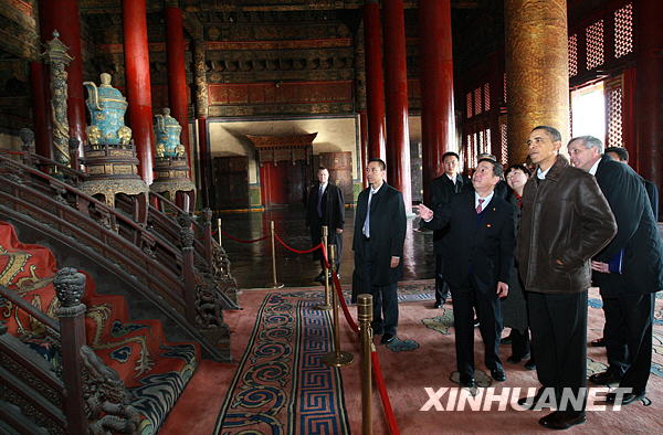 脫下西裝,摘掉領(lǐng)帶,不帶閣僚,美國總統(tǒng)奧巴馬17日下午在緊張的政治活動(dòng)間隙,忙里偷閑來到故宮博物院參觀。