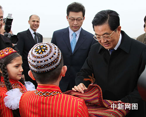 土庫曼斯坦政府官員和當?shù)厝A僑華人趕到機場迎接。兩名土庫曼兒童分別向胡錦濤獻花和面包,請胡錦濤掰下兩小塊面包品嘗。