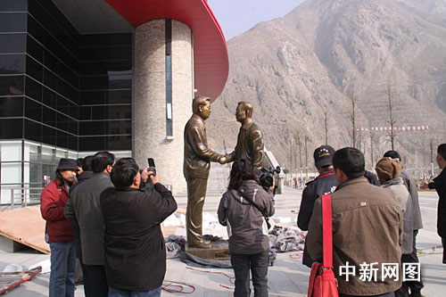 中新網(wǎng)汶川1月29日電(薛升玉 張瑤)1月29日上午,汶川縣體育館前鑼鼓陣陣,“咔嚓”的快門聲不斷,一尊高2.98米、寬1.68米、厚0.94米的“胡主席和溫總理在災(zāi)區(qū)”大型雕塑吸引了許多過往群眾駐足留影。這尊由陜西省大荔縣宣傳部捐贈(zèng)的大型雕塑,將收藏到汶川縣禹羌博物館。