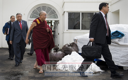 華盛頓的積雪還未融化,就在后門邊上,幾個(gè)黑色大垃圾袋鼓鼓囊囊地挺立著。身著藏服的達(dá)賴不得不暫時(shí)卸下臉上的喜色,小心翼翼地從路面上繞行過去。
