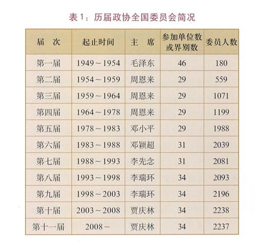 政協(xié)全國委員會每屆任期五年,設(shè)主席、副主席若干人、秘書長。歷屆政協(xié)全國委員會簡況如表1。