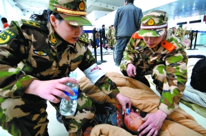 只要有傷員,羅愛(ài)華和戰(zhàn)友就用肩扛、用手抬,將傷者抬進(jìn)大廳輸液、包扎……等待專機(jī)到來(lái)。13時(shí)50分,一名重傷女孩被醫(yī)療隊(duì)從車上接到候機(jī)大廳。羅愛(ài)華看到女孩因缺水嘴唇干裂、臉發(fā)青。她立即拿來(lái)礦泉水,一口一口喂到女孩嘴里。可能是太長(zhǎng)時(shí)間沒(méi)喝水,女孩一口氣連喝十幾口。喝了近半瓶水后,女孩臉色開(kāi)始好轉(zhuǎn),并用感激的眼神打量這位阿姨。這時(shí),接傷員的專機(jī)到達(dá),女孩被抬上飛機(jī)。