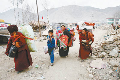 青海師范大學3年級學生伊西措毛是在15日凌晨兩點趕回玉樹的,但夜色并不能完全向她掩蓋地震造成的創(chuàng)傷。她路過結古鎮(zhèn)口塌掉的瑪尼堆,這是全世界最大的一個,曾讓玉樹人引以為傲;她路過勝利路和民主路交界的三叉路口,原先最繁華的商業(yè)中心已經被夷為平地;最后,她來到自己的家門口,這里保存著她從4歲開始的所有夢想。