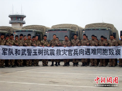 中新網(wǎng)4月21日電(劉洪星)今日,玉樹災(zāi)區(qū)巴塘機(jī)場(chǎng)武警青?傟(duì)第四支隊(duì)全體官兵、全體解放軍部隊(duì)、醫(yī)療單位、機(jī)場(chǎng)工作人員以及其他救援人員在候機(jī)樓前停車場(chǎng)舉行三分鐘默哀活動(dòng),現(xiàn)場(chǎng)降半旗,所有人員駐足默哀、所有車輛鳴笛、防空警報(bào)響起。同時(shí)玉樹州所有救援部隊(duì)、救援單位、各級(jí)人員同期舉行為地震死難人員默哀活動(dòng)。