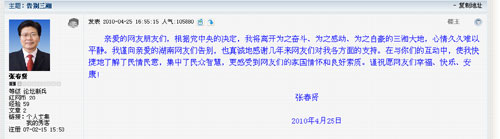 張春賢在帖中說:親愛的網友朋友們,根據(jù)黨中央的決定,我將離開為之奮斗、為之感動、為之自豪的三湘大地,心情久久難以平靜。我謹向親愛的湖南網友們告別,也真誠地感謝幾年來網友們對我各方面的支持。在與你們的互動中,使我快捷地了解了民情民意,集中了民眾智慧,更感受到網友們的家國情懷和良好素質。謹祝愿網友們幸福、快樂、安康!