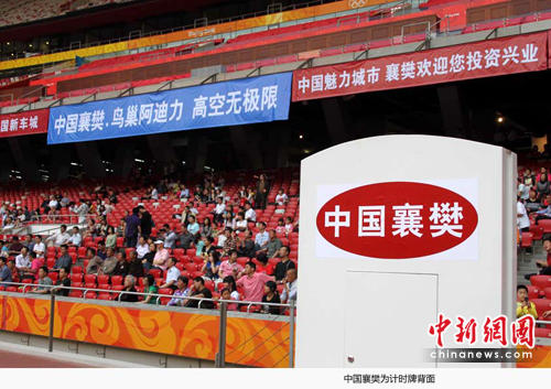 目前,襄樊市已在鳥巢體育場外圍懸掛236面宣傳襄樊形象的廣告彩旗,場內懸掛巨幅宣傳標語20幅,在阿迪力居住的小屋三面噴繪襄樊古城風貌、古隆中、汽車城等內容的宣傳片。下一步,還將在鳥巢內舉辦襄樊日等活動,以提高襄樊知名度,提升襄樊形象。