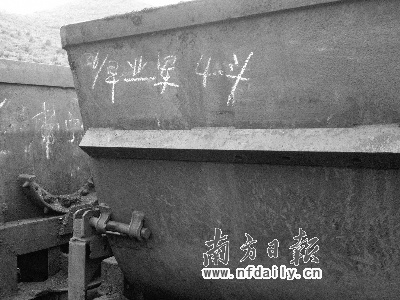 記者昨日在現(xiàn)場看到,礦井出口處擺著9名死難礦工的遺體,遺體旁是一排車斗,一個車斗上還有工頭用白色粉筆記錄下的死者李業(yè)軍5月26號的產(chǎn)量———早班4斗。