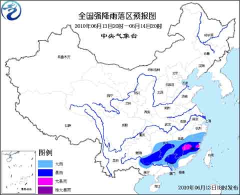 中央氣象臺6月13日18時發(fā)布暴雨藍色預警: