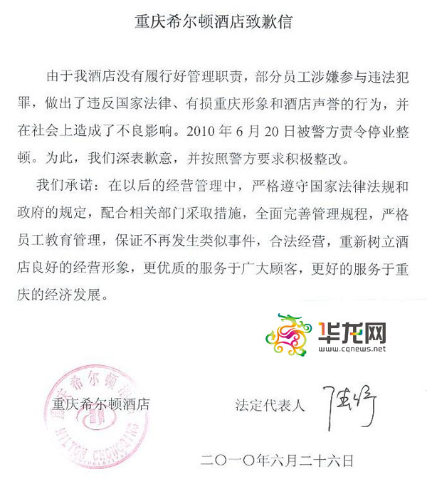 陸紓在致歉信中稱,由于酒店沒有履行好管理職責,部分員工涉嫌參與違法犯罪,做出了違反國家法律、有損重慶形象和希爾頓酒店聲譽的行為,并在社會上造成了不良影響,6月20日酒店被警方責令停業(yè)整頓!皩Υ,我們深表歉意,并按照警方要求積極整改!