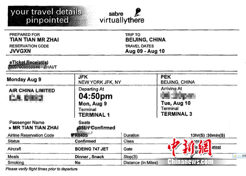 據(jù)了解,翟田田所乘坐的從紐約肯尼迪國際機場直飛中國北京的航班,將于10日下午抵達北京,屆時翟田田的親友將在北京接機。(完)