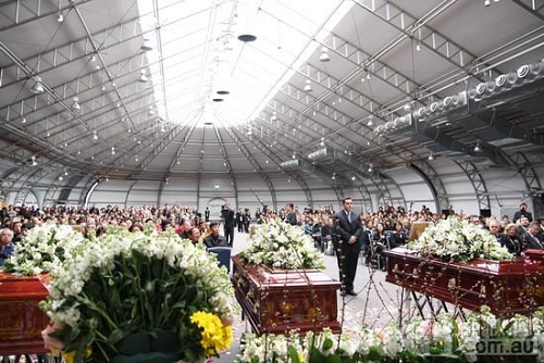 追思會的最后階段,所有親友和來賓陸續(xù)上前,向遺體告別并進(jìn)獻(xiàn)獻(xiàn)花,會場內(nèi)響起了歌曲《回家》。下午一點,眾人目送靈柩離場。五具靈柩被運(yùn)送前往麥夸里墓園。