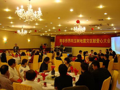 會(huì)上,吳少康會(huì)長(zhǎng)帶頭捐款,當(dāng)場(chǎng)個(gè)人捐贈(zèng)12萬(wàn)蘭特(南非貨幣單位),著名愛(ài)國(guó)老華僑李鏗發(fā)先生捐款20萬(wàn)蘭特,知名老華僑梁職臣先生(以無(wú)名氏名義)、南部非洲中華福建同鄉(xiāng)總會(huì)和南部非洲上海工商聯(lián)誼總會(huì)各捐款10萬(wàn)蘭特,南部非洲上海世博會(huì)推委會(huì)主席曹行知先生、南部非洲華僑華人工商聯(lián)合總會(huì)和南部非洲粵港澳總商會(huì)各捐款8萬(wàn)蘭特,全非洲華人女企業(yè)家工商聯(lián)合總會(huì)、南部非洲吉林總商會(huì)、南部非洲中原總商會(huì)、南非江蘇省同鄉(xiāng)會(huì)和南非紫荊會(huì)等20多個(gè)僑團(tuán)及其僑領(lǐng)也都分別以?xún)S團(tuán)或個(gè)人的名義踴躍捐款,爭(zhēng)相表達(dá)對(duì)災(zāi)區(qū)人民的關(guān)愛(ài)之情。當(dāng)日,總計(jì)為地震災(zāi)區(qū)捐款達(dá)到138萬(wàn)另8千蘭特(R1,388,000元)。