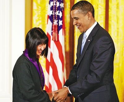 頒獎典禮在白宮東廳舉行。穿著黑色鑲紅邊套裝的林瓔,是獲獎的唯一亞裔。奧巴馬為她掛上紫綬帶的金質獎章時,司儀誦讀獎狀指出,此獎是表揚林瓔作為建筑師、藝術家和環(huán)保人士的卓著成就,她設計越戰(zhàn)紀念碑的洞見,顯示她深切了解人們對周遭世界的感受。