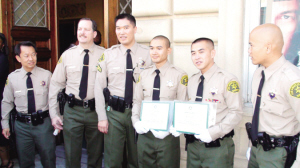 畢業(yè)后被分配到洛杉磯雙塔監(jiān)獄工作的陳得光,7歲的時(shí)候跟隨父母從香港移民美國(guó),并在柔似密安家落戶(hù)。從小就想當(dāng)警察的他06年報(bào)名加州大學(xué)爾灣分校,專(zhuān)修犯罪心理學(xué),畢業(yè)后又在今春報(bào)名參加了洛縣警局警察培訓(xùn)學(xué)校,經(jīng)過(guò)19周的緊張訓(xùn)練,終于在今天的畢業(yè)典禮上穿上了夢(mèng)寐已久的警服。