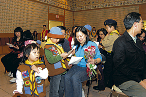 與丈夫史文山在教國際標(biāo)準(zhǔn)舞的沈柏容,在看到9歲的女兒史洛謙,送了張印有一個大大“孝”字的卡片和一大花束康乃馨時,笑得合不攏嘴。佛光童軍小兄妹譚明駿和譚明麗,也各送了張“孝”卡給媽媽王淑芬。王淑芬說,能在佛光山收到子女的愛心卡和康乃馨,很有意義。