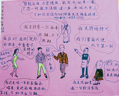 張貼在飲食中心周圍的有關(guān)漫畫大字報顏色非常鮮艷,內(nèi)容都是以“馬華武林大會”、“支持特大”、“翁大使要第一劍”、“中委會不支持特大”、及“雙龍出海,混云卷風(fēng),龍虎斗,必有一傷”,及勸人退一步海闊天空等字眼。