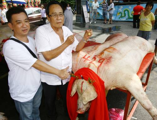 他說,由于早前附近都是從事養(yǎng)豬業(yè),生豬大賽旨在聯(lián)誼居民,讓大家促進交情。祭拜儀式完畢后,所有的生豬將全數(shù)切割分發(fā)給民眾。