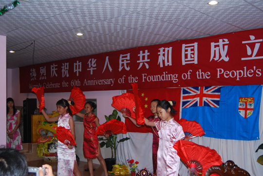 隨著鏗鏘有力的鑼鼓,新獅騰飛起舞,熱情奔放的舞獅表演引來(lái)陣陣喝彩;中華學(xué)校學(xué)生們表演了中華傳統(tǒng)舞蹈—扇子舞和斐濟(jì)土風(fēng)舞,大家對(duì)孩子們清新可愛的表演報(bào)以熱烈的掌聲;斐濟(jì)武術(shù)協(xié)會(huì)林國(guó)錦先生表演的中華拳術(shù)、劍術(shù)、棍術(shù)等多種套路,展現(xiàn)了中華武術(shù)的剛健和豪氣。大會(huì)還進(jìn)行了國(guó)慶知識(shí)有獎(jiǎng)競(jìng)猜、幸運(yùn)抽獎(jiǎng)等活動(dòng),內(nèi)容十分豐富。最后的特別節(jié)目是斐濟(jì)華人工商聯(lián)汪戈莉女士獨(dú)唱“今天是你的生日”,幾個(gè)孩子手推裝載生日蛋糕的小車緩緩上場(chǎng),燭光裊裊,大家共同為偉大母親六十壽辰祝福,將全場(chǎng)氣氛推上高潮。最后全場(chǎng)起立放聲高歌《歌唱祖國(guó)》,整個(gè)活動(dòng)在對(duì)祖國(guó)的衷心祝福中落下帷幕。