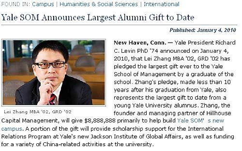 據(jù)耶魯大學(xué)公共事務(wù)辦公室網(wǎng)站1月4日消息,美國耶魯大學(xué)校長(zhǎng)理查德·萊文教授宣布,耶魯2002屆畢業(yè)生張磊(音)已經(jīng)承諾,將向耶魯大學(xué)管理學(xué)院(SOM)捐贈(zèng)888萬8888美元。這是到目前為止,耶魯管理學(xué)院畢業(yè)生捐贈(zèng)的最大一筆個(gè)人捐款。