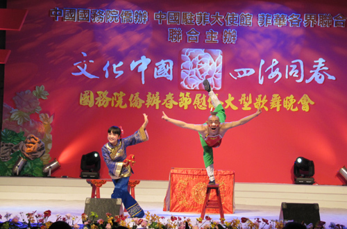 這是國(guó)務(wù)院僑辦和中國(guó)海外交流協(xié)會(huì)“文化中國(guó)·四海同春”2010年春節(jié)赴菲律賓藝術(shù)小組在演出,只見臺(tái)下掌聲不斷,臺(tái)上精彩紛呈:《滾燈》語(yǔ)言詼諧,情節(jié)幽默,將川北燈戲的民間生活情趣描繪得淋漓盡致!蹲兡槨肥谴▌≈猩衿婷利惖慕^技,大木偶變臉更是精彩絕倫,令人嘆為觀止。