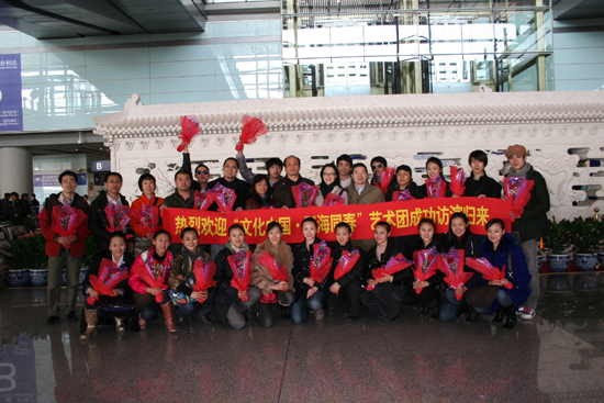 中新社北京3月9日電 (南若然)9日中午,“文化中國·四海同春”赴歐洲藝術團結束了在法國、英國、比利時和意大利的慰僑演出后,返回北京。