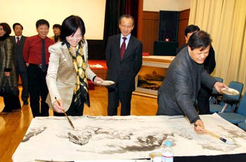 全日本華人書法家協(xié)會主席劉洪友代表藝術(shù)家們感謝使館舉辦溫馨親切的元宵節(jié)招待會,感謝使館長期以來對海外藝術(shù)家的支持。他呼吁大家廣集才智、團(tuán)結(jié)一心,為祖國的進(jìn)一步繁榮昌盛貢獻(xiàn)自己的力量。劉洪友還特別提到了今年國內(nèi)南方的雨雪冰凍災(zāi)害,倡議大家關(guān)心災(zāi)區(qū),并以“在日華人文聯(lián)籌委會”的名義,帶頭捐款,為災(zāi)區(qū)獻(xiàn)上了一份愛心。