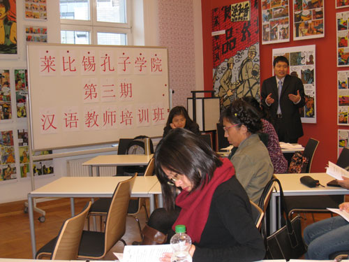 本期培訓(xùn)班的主講是萊比錫孔子學(xué)院對外漢語教師高永安。他結(jié)合德語、漢語的語音比較,講述了對德漢語教學(xué)中的語音教學(xué)技巧;結(jié)合漢語的詞匯特點(diǎn),講述了詞匯教學(xué)的主要方法,并重點(diǎn)介紹了語素教學(xué)法。參加培訓(xùn)的教師們對課堂內(nèi)容很感興趣,他們一邊聽講,一邊提問題,課堂氣氛十分活躍。學(xué)員們還分享了各自在教學(xué)實(shí)踐中的經(jīng)驗(yàn),探討了教學(xué)中出現(xiàn)的問題,并共同尋求解決的辦法。