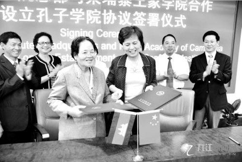 經(jīng)過近兩年的精心籌備,設(shè)立王家學(xué)院孔子學(xué)院的條件已經(jīng)成熟,中柬合作雙方加緊履行申辦孔子學(xué)院的相關(guān)手續(xù)。8月12日,應(yīng)九江學(xué)院的邀請(qǐng)并受宋安副總理的委托,柬埔寨王家學(xué)院院長(zhǎng)克洛堤達(dá)博士率王家學(xué)院代表團(tuán)抵達(dá)北京,訪問國家漢辦暨孔子學(xué)院總部?鬃訉W(xué)院總部總干事許琳女士會(huì)見了克洛堤達(dá)博士,雙方分別代表孔子學(xué)院總部和柬埔寨王家學(xué)院,簽署了《中國孔子學(xué)院總部與柬埔寨王家學(xué)院關(guān)于合作設(shè)立王家學(xué)院孔子學(xué)院的協(xié)議》。至此,柬埔寨第一家孔子學(xué)院正式宣告誕生。