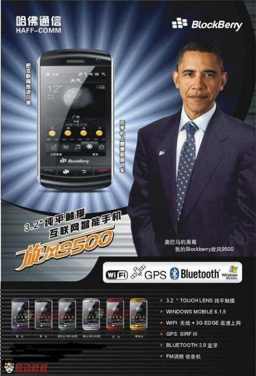 據(jù)國外媒體報道,中國一家名為“哈佛通訊(HAFF-COMM)”的山寨手機(jī)廠商發(fā)布了一款RIM黑莓(BlackBerry)山寨機(jī)”BlockBerry旋風(fēng) 9500“,令人意外的是,美國總統(tǒng)奧巴馬(Barack Obama)竟然出現(xiàn)在該款手機(jī)的宣傳海報上。