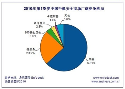 在國內(nèi)的手機(jī)安全廠商中,網(wǎng)秦以63.1%的市場占有率名列第一,信安易占23.9%名列第二,360安全衛(wèi)士擁有3.8%的市場占有率名列第三。