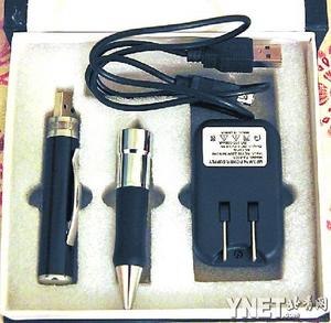 在談好280元的價(jià)格后,店主從柜臺(tái)的角落里拿出了一個(gè)上鎖的黑包,打開(kāi)后從里面拿出了一個(gè)黑色的盒子,上寫英文“MP9 Digital Pocket Video Recorder”(MP9數(shù)字口袋攝像機(jī))。整套產(chǎn)品由四部分構(gòu)成:筆頭、筆桿、充電器和USB線。該筆外形與一般的圓珠筆相差不大,其中筆桿為“偷拍筆”的核心部分,筆桿的頂端有一個(gè)開(kāi)關(guān)按鈕,筆夾的上方有一個(gè)針眼攝像頭,筆桿背面有兩個(gè)小孔,上方小孔是指示燈,下方為收音孔。筆桿最下端有一個(gè)USB的接口,起到傳輸畫面的作用。據(jù)店主介紹,筆桿里面還有一個(gè)U盤存儲(chǔ)器,大小由2G到8G不等。