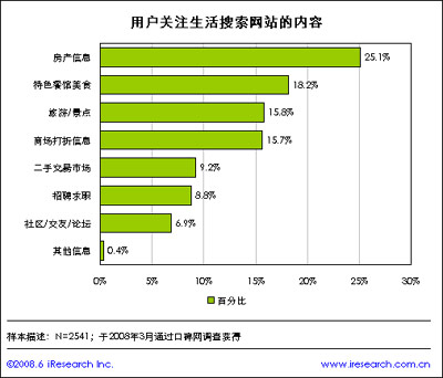 調(diào)查數(shù)據(jù)顯示,用戶感興趣的生活服務(wù)信息集中在四大類,其中美食占18.20%,旅游占15.83%,商家打折15.66%,房產(chǎn)25.09%,在房產(chǎn)信息中,出售房屋信息關(guān)注度最高,占到總整的6.4%,相對(duì)而言,其它類似家政、交友、招聘信息關(guān)注的程度較小。
