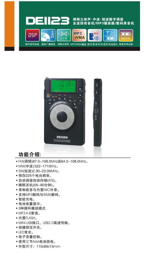 此外,德勁公司近期還推出了另一款超薄數(shù)字調(diào)諧收音機(jī)DE1123。該機(jī)內(nèi)嵌MP3,集全波段數(shù)碼收音、數(shù)碼錄音、MP3播放多功能于一體,收錄放自如;而其外型尺寸只有110*69*13mm,小巧玲瓏,方便攜帶。DE1123不僅功能強(qiáng)勁,外型小巧超薄,而且塑料外殼手感非常好,按鈕靈活,非常人性化。FM調(diào)頻范圍在87.00-108.00MHz或64.00-108.00之間可以互相轉(zhuǎn)換收聽,非常適合校園學(xué)生一族,F(xiàn)M\MW\SW可一鍵切換,SW快速米波段轉(zhuǎn)換,彌補(bǔ)了沒有數(shù)字鍵的遺憾。據(jù)了解,該機(jī)在傳統(tǒng)收音機(jī)的基礎(chǔ)之上嵌入數(shù)碼元素,創(chuàng)新技術(shù)在國(guó)內(nèi)行業(yè)尚屬首創(chuàng)。