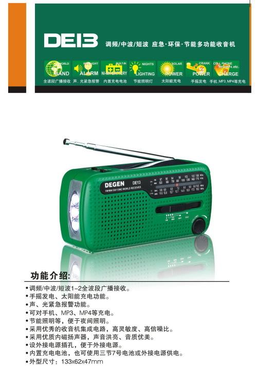 在缺電的災(zāi)區(qū),隨同前往的德勁電子公司研發(fā)人員發(fā)現(xiàn),如果能讓收音機(jī)兼?zhèn)涫謾C(jī)充電器和手電筒的功能,就能解決晚上照明和個(gè)人應(yīng)急通信。幾個(gè)月后,一款集應(yīng)急、環(huán)保、節(jié)能等多功能于一體的收音機(jī)新品——德勁DE13研發(fā)成功并投放市場(chǎng)。德勁DE13具有全波段收音、手搖發(fā)電、太陽(yáng)能充電功能,而且可以對(duì)手機(jī)、MP3、MP4等進(jìn)行充電,該機(jī)還配有節(jié)能照明燈,便于夜間照明。該機(jī)型投放市場(chǎng)后,還受到了許多戶外一族的追捧,由于特有的手搖發(fā)電、太陽(yáng)能充電功能(機(jī)器內(nèi)置充電電池),外出旅游的時(shí)候不僅可以收聽廣播,了解新聞動(dòng)態(tài)和天氣變化情況,還可以為手機(jī)充電。DE13還具有聲光警報(bào)功能,當(dāng)遇到危險(xiǎn)和需要救助時(shí),利用收音機(jī)發(fā)出來的求救聲音和紅色閃光,引導(dǎo)救援。