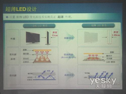 再說背光源與側(cè)光源的區(qū)別,根據(jù)上圖我們可以看出,與傳統(tǒng)LCD光源組件和投射原理相比,LED側(cè)光源由機(jī)身兩側(cè)發(fā)出光源,通過三星內(nèi)置的高透光率的導(dǎo)光板的作用,使光線投射到面板上。限制LCD厚度最大的就是熒光燈的厚度,側(cè)光源位于兩側(cè)的投射位置,使得其并不占據(jù)電視厚度的空間。