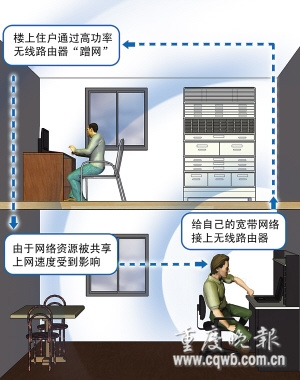 “這簡直與偷盜無異!奔易∈瘶蜾伩茍@一路的劉先生,最近家里的寬帶網(wǎng)絡(luò)總是“堵車”,有時連上個QQ都十分吃力,經(jīng)常斷斷續(xù)續(xù)。后來找人一看,原來是家里用的無線路由器,被樓上新搬來的租賃戶用筆記本電腦“順手牽羊”連上去了。