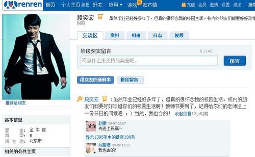 人人網(wǎng)明星主頁(yè)上的眾多明星們:光良、尚雯婕、游鴻明、段奕宏、王寶強(qiáng)等,還有世界小姐張梓琳和王靜瑤以及以那多為代表的新一代年輕作家都紛紛更新自己的狀態(tài)表示對(duì)恩師的問候,有的明星還在主頁(yè)上講述自己學(xué)生時(shí)代的趣事,而機(jī)構(gòu)主頁(yè)中的《環(huán)球時(shí)報(bào)》和光線傳媒《最佳現(xiàn)場(chǎng)》等也是在主頁(yè)上更新了教師節(jié)狀態(tài)以此表示對(duì)老師們的敬意。從電話、短信、電子郵件,表達(dá)祝福的方式在不斷演進(jìn),當(dāng)前社交網(wǎng)站因其基于真實(shí)用戶而產(chǎn)生的真實(shí)情感,成為人們表達(dá)祝福的最新選擇。