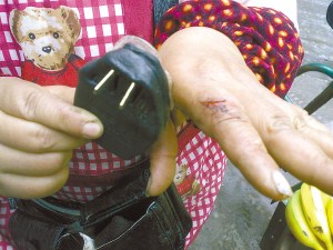 昨天,鄧女士拿著已燒毀的萬能充電器,其左手食指被炸傷。