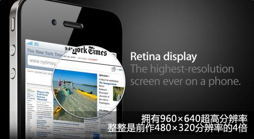毫無疑問,iPhone4硬件層面的最大亮點(diǎn)之一,則是其號(hào)稱“Retina Display”的顯示屏幕,其官方稱,該屏幕擁有960×640超高分辨率,是480×320分辨率的4倍,也就是說,iPhone4一屏可顯示的內(nèi)容量是iPhone3的四倍。即使是目前一些高端Android平臺(tái)的手機(jī),最高分辨率也只有854×480,與其仍有不小的差距。